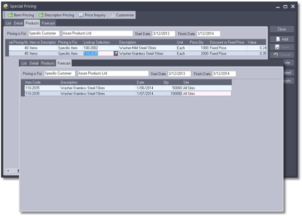 Reduce the time spent on data entry by automatically grouping all special prices with the same Date and Customer range, and create specific forecasts against special priced items. Increase your accuracy by selecting sub-categories in the Order Pricing and Discount Matrixes, and use the new One Per Qty rule to set a quantity of items inserted based on the quantity of the main product sold (i.e. For every 5 items the customer buys, they receive a bonus of 1).